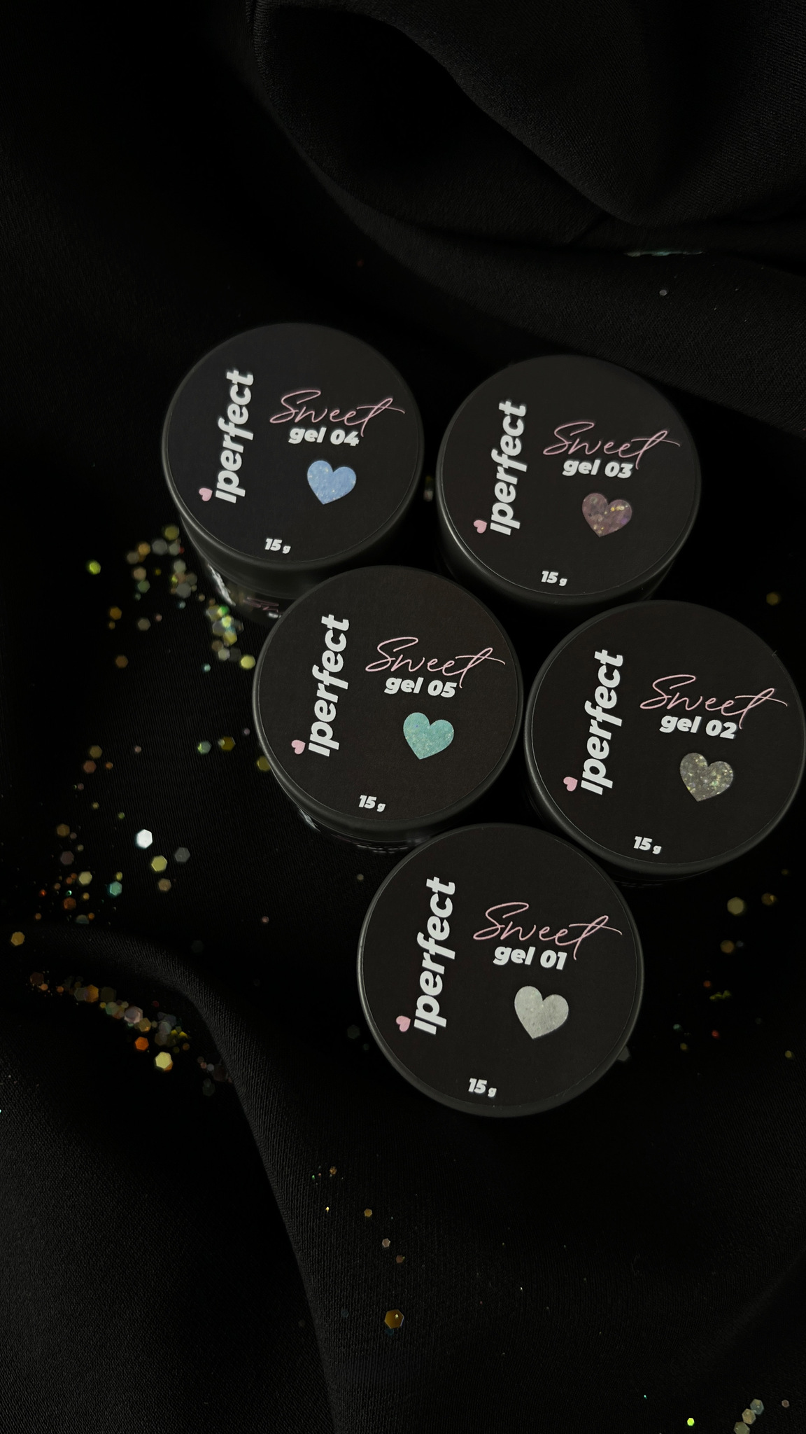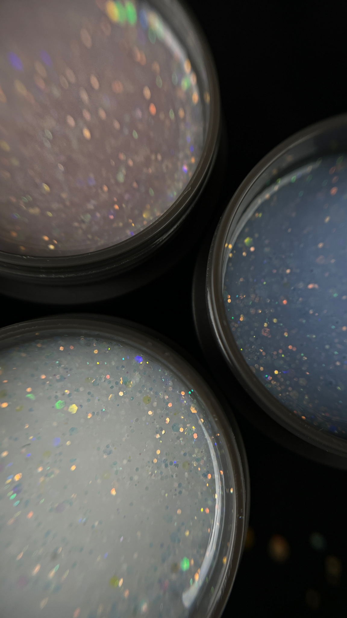 гелей для моделирования, укрепления и ремонта с голографическими блестками и шестигранниками.