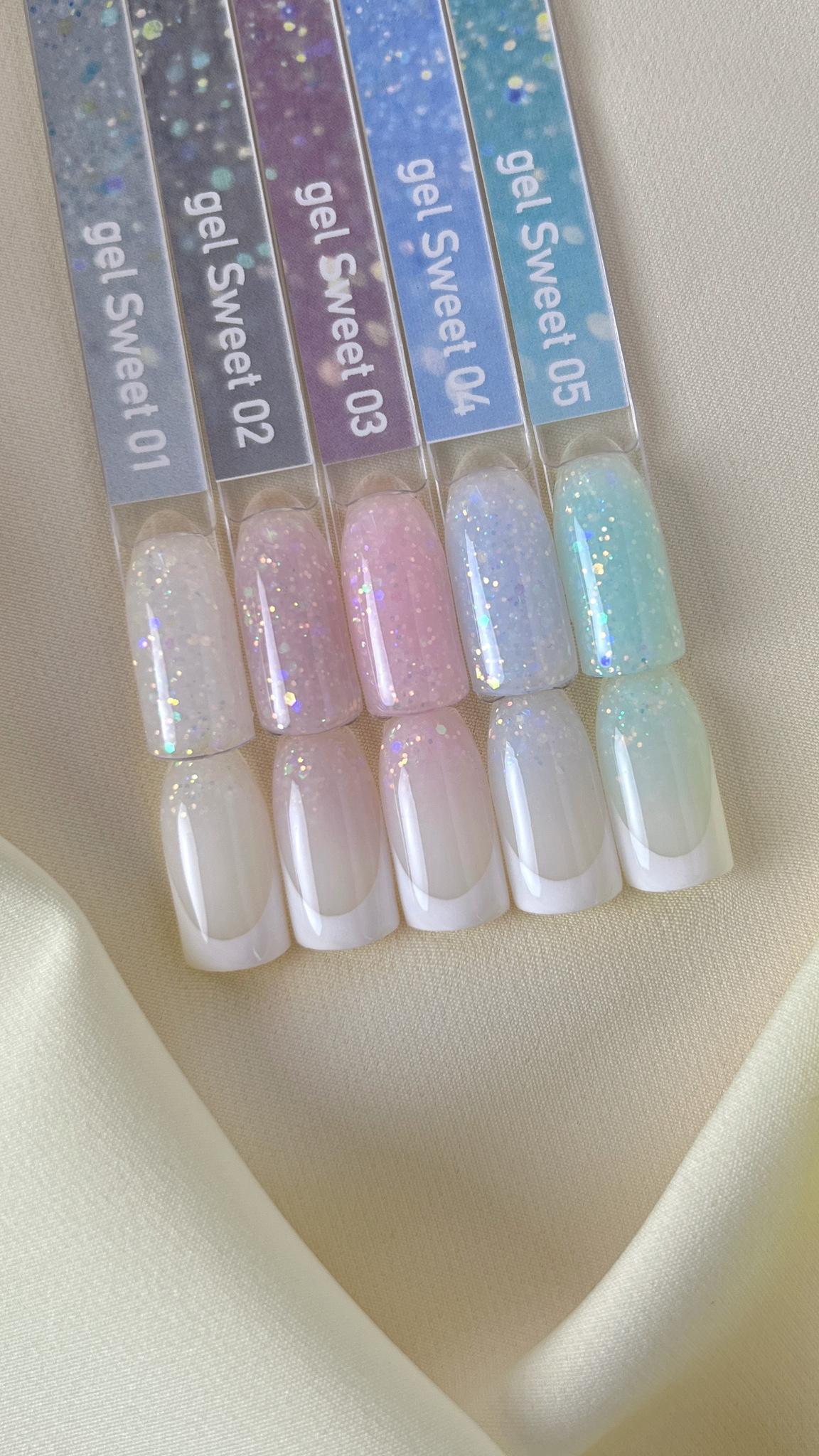нанесите sweet gel в выравнивающий слой, просушите в uv/led 2 мин./1 мин. Покройте топовым покрытием с глянцевым или матовым эффектом, полимеризуйте в uv/led лампе 60 секунд.